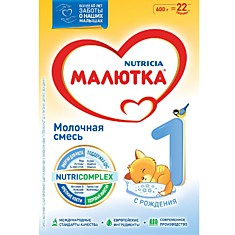 Малютку производит компания Nutricia, эксперт в питании для детей раннего возраста. Именно поэтому Малютка соответствует и российским, и международным стандартам качества. У нее оптимальная рецептура, высокие стандарты и строгий контроль производства, качественные ингредиенты.Грудное молоко – идеальное питание для роста и развития малыша. Но при его недостатке или отсутствии возможности грудного вскармливания, Малютка поможет маме позаботиться о сбалансированном рационе малыша. Смесь Малютка 1 с рождения содержит:- Пребиотики ГОС/ФОС – натуральные пищевые волокна, по составу и свойствам приближенные к пребиотикам грудного молока для улучшения пищеварения- Витамины и минералы, необходимые для гармоничного развития в соответствии с возрастом малыша.